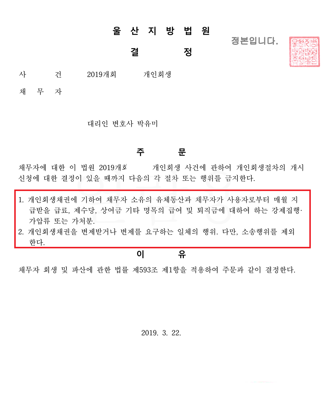 사업자의 경우 소득 증빙과 청산가치 반영을 위해서는 재무제표까지 제출하고, 감가상각 등의 계산으로 재산가치 산정이필요하기에 개시결정은 늦어질 수밖에 없는 상황에서 금지명령이 꼭 필요하였기에 많은 준비끝에 금지명령부터 신청하였고 금지명령이 인용된 후 꾸준한 준비를 통해 회생까지 원활하게 진행할 수 있었습니다.